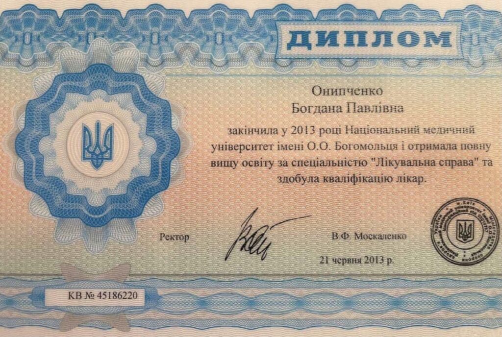 У 2013 році закінчила Національний медичний університет імені О.О. Богомольця, отримала повну вищу освіту за спеціальністю “Лікувальна справа” та здобула кваліфікацію лікаря. В 2021 році Департамент охорони здоров’я підтвердив кваліфікацію за фахом анестезіологія.